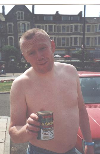 Um die Wartezeit bis zur Räumung des Zimmers zu überbrücken und das nötige Kleingeld für den Frühschoppen zusammen zu bekommen, begründeten wir kurzerhand eine Kollekte für notleidende Skinheads und schickten Barry sogleich mit einer Spendenbüchse zum Sammeln auf den Weg. Der war allerdings wenig erfolgreich, obwohl er sich redlich Mühe gab, möglichst notleidend und abgebrannt auszusehen und so beschlossen wir kurzerhand mit dem restlichen Bier, das vom Vortag übrig geblieben war, zur Touristen- Information zu ziehen, um dort die Zeit bis zum Auftritt von „Running Riot“ zu vertrödeln . |