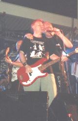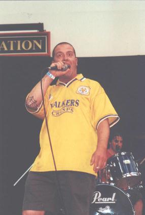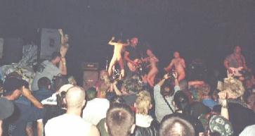 | Leider hatten sich auch an diesem Abend wieder einige dieser Birnen im Dome eingefunden die, offensichtlich durch einen Typen animiert, der die halbe Geschichte des 3. Reiches auf seinen Rücken tätowiert hatte, meinten ihre politische Ausrichtung durch den ausgestreckten rechten Arm kundtun zu müssen.(Ein Photo der Tätowierungen dieses Typen habe ich mir erspart, da unsere Seite ansonsten sicherlich reif für den Index gewesen wäre. Nur soviel sei zu den Motiven gesagt. Zu sehen waren der hässliche Irre mit dem kleinen Bart und dem schmierigen Seitenscheitel, natürlich grüßend, dann sein debiler Stellvertreter, einige Sturzkampfbomber, eine Klansmütze und noch einiger anderer Unsinn. Wenn das kein Geschichtsbewusstsein ist.) | | Abgesehen von den paar Boneheads, durch die sich weder Kev und die Jungs von „Condemned 84“ noch der Rest des Publikums weiter stören ließen, war der Auftritt der Band allerdings mal wieder absolut genial und „Condemned 84“ kamen dieses Mal sogar noch besser rüber, als bei ihrem letzten Auftritt beim HIS in Morecambe vor zwei Jahren, zumal sie auch dieses Mal wesentlich besser ausgesteuert waren. |