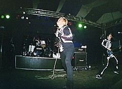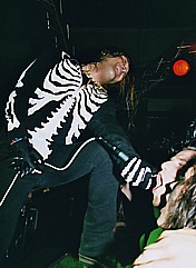 | Nach einer ausgedehnten Umbaupause und einem relativ langen, ja schon irgendwie fast zu langen Vorspann vom Band, kamen dann schließlich auch die Horrorpunker endlich auf die Bühne. Stilistisch ließe sich die Musik der Jungs wohl am ehesten als eine recht gute Mischung aus "Cobra", einigen wenigen Elementen "Gruesome" und "Tettsui" und selbstredend einigen Anteilen "Misfits" beschreiben und auch wenn die Musik für einige der Anwesenden offensichtlich zu viel "Wow Wow Wow" und zu wenig Aggro und Horror hatte, und auch für meinen Geschmack nicht wirklich an die Misfits herankommt, - auch ich hatte nach den Plattencovern doch etwas mehr Horrorschow erwartet-, warīs insgesamt ein recht nettes Konzert, das die Japaner da ablieferten. |