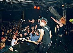 Leatherface machten musikalisch gesehen zunächst auch Žnen ganz ordentlichen Eindruck und lieferten recht annehmbaren, melodischen Punkrock ab, der teils etwas an die späten Hüsker Dü erinnerte, insgesamt für meinen Geschmack doch schon etwas zu seicht war, aber dennoch von den meisten Anwesenden ziemlich geschätzt wurde. Offensichtlich waren die drei an diesem Abend allerdings nicht nur darauf aus, Musik zu machen, sondern auch darauf, sich Žne Keilerei mit dem Publikum zu liefern. |